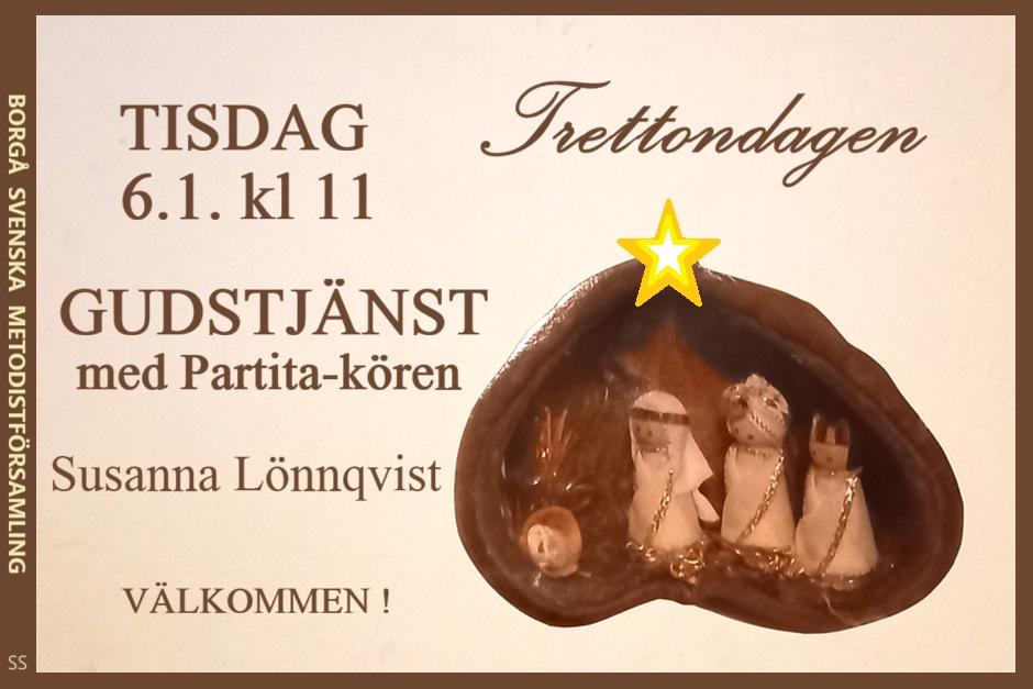 Vi firar gudstjänst tillsammans med Partita-kören 6.1.2026 kl. 11:00. Efter gudstjänsten äter vi kyrksoppa.